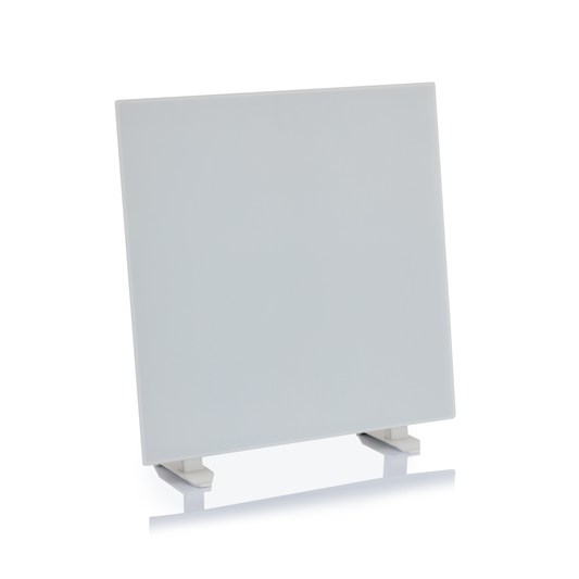 Die Frontseite besteht aus einem hochwertigem 4 mm Einscheiben-Sicherheitsglas (ESG-H) gehärtet mit glaskeramischer Beschichtung. Das weiss matte Sicherheitsglas mit granularer Oberfläche bringt eine effizientere Wärmestrahlung im Vergleich zu Infrarotheizungen mit glatter Oberfläche.